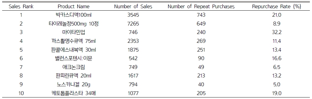 매출 상위 품목은 전국 428개 패널 약국에서 수집된 2024년 판매 기록을 기반으로 선정하였다. 이 중 상시 판매가 이루어지고 POS 데이터의 기록이 안정적으로 관리된 10개 약국을 표본 약국으로 선정하여 세부 구매 이력 데이터를 활용하였다.