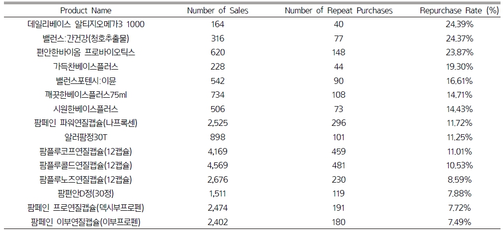 한편, 휴베이스 브랜드 제품은 매출 상위 100개 품목 중 15개(62.5%)가 포함되었으며, 이 중 평균 이상 재구매율을 보인 제품은 모두 건강기능식품군이었다. 특히 데일리베이스 rTG 오메가-3 1000과 밸런스: 간건강(청호추출물)은 각각 24.39%와 24.37%의 재구매율을 기록하여 가장 높은 수준을 나타냈다(Table 3).