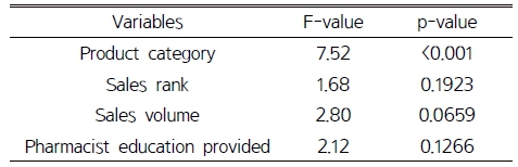 재구매율(repurchase rate)은 동일 제품을 동일 고객이 6개월 내 2회 이상 구매한 비율로 정의하였다. 제품 분류는 의약품, 건강기능식품, 의약외품, 기타(동물의약품 등)로 구분하였다. 매출 순위는 높은 군, 중간 군, 낮은 군으로 나누었고, 판매량과 약사 교육 제공 여부도 독립변수로 분석하였다.