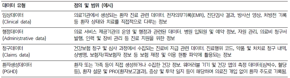 보건의료 데이터는 임상데이터, 행정데이터, 청구데이터, 환자생성데이터로 구분된다. 임상데이터는 EMR/EHR, 진단검사 결과, 영상 자료 등 진료 과정에서 생성되는 환자 중심 데이터이다. 행정데이터는 의료기관 운영 및 자원 관리 관련 정보이며, 청구데이터는 건강보험 청구 시 발생하는 의료 행위, 약제, 상병명 정보를 포함한다. 환자생성데이터(PGHD)는 웨어러블 기기나 모바일 앱을 통해 수집되는 활동량, 심박수, 혈당 등과 환자가 기록하는 증상 일지 등이다. 이러한 데이터가 종합될 때 개인의 건강 상태와 의료 이용 행태를 포괄적으로 파악할 수 있다.5,6) Table 1