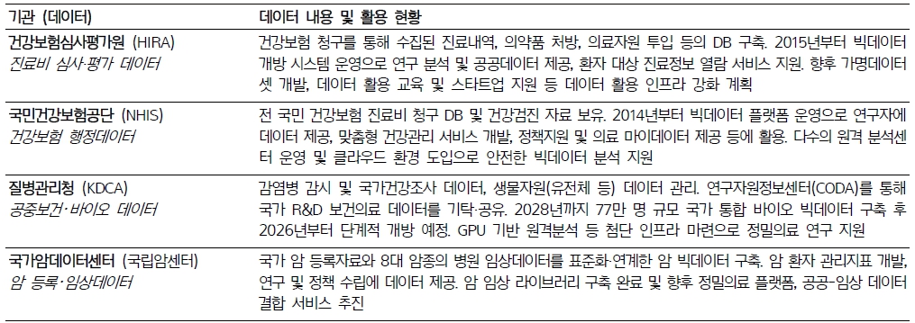 한국은 전 국민 건강보험 제도를 기반으로 방대한 행정데이터와 정보화된 의료시스템을 갖추고 있으며, 주요 공공기관을 중심으로 보건의료 데이터 인프라가 구축・운영되고 있다.8,9) 건강보험심사평가원(HIRA)은 2010년대 중반부터 청구데이터 기반의 “보건의료 빅데이터 개방시스템”을 운영하며 진료정보・의약품 처방・의료자원 현황 등을 표준화해 연구분석 서비스와 공공데이터 개방을 제공하고 있다.10) 국민건강보험공단(NHIS)은 2014년부터 “건강보험 빅데이터 플랫폼”을 구축해 인구통계, 진료내역, 투약정보, 건강검진 결과 등을 연구자 및 공공기관에 제공하고, 원격접속 분석센터와 클라우드 기반 분석환경을 확충하고 있다.11) 질병관리청(KDCA)은 감염병 감시와 국민건강조사를 주관하면서 2028년까지 77만 명 규모의 국가 통합 바이오 빅데이터를 구축해 2026년 하반기부터 연구자에게 단계적으로 개방할 예정이며, 국립암센터는 2021년 국가암데이터센터로 지정된 이후 전국 8대 암종 임상데이터를 수집・표준화해 “암 임상 라이브러리”를 구축하고 연구자와 정책입안자에게 개방하고 있다. 이와 함께 의료데이터 중심병원 지정, 공공데이터 연계 허브(K-CURE) 구축 등으로 분산된 보건의료 데이터를 결합·활용할 수 있는 기반도 마련되고 있다.12)